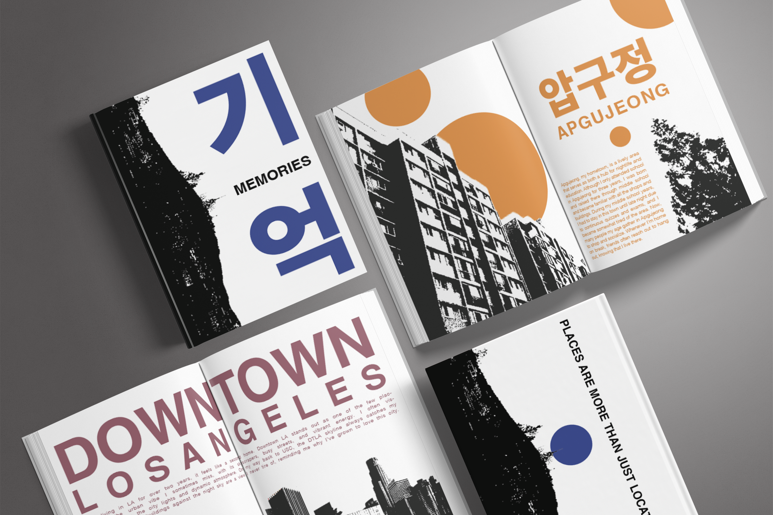 MEMORIES is a publication that traces my movement through cities such as Seoul, Baltimore, and Los Angeles, using black-and-white photography paired with a single accent color on each spread to reflect the emotional atmosphere of each place. Through a blend of images and brief narrative passages, the book captures moments of transition, nostalgia, and personal growth tied to these environments. The project explores how memory and geography intertwine, revealing how the places we inhabit leave lasting impressions on identity.